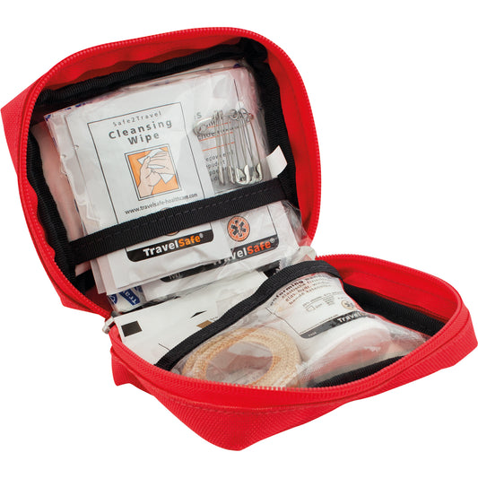 Een basis EHBO-set bevat pleisters, verband, ontsmettingsmiddel, blarenpleisters, pincet, schaartje en handschoenen. Uitgebreidere sets hebben ook dekens, noodponcho’s en extra hulpmiddelen.