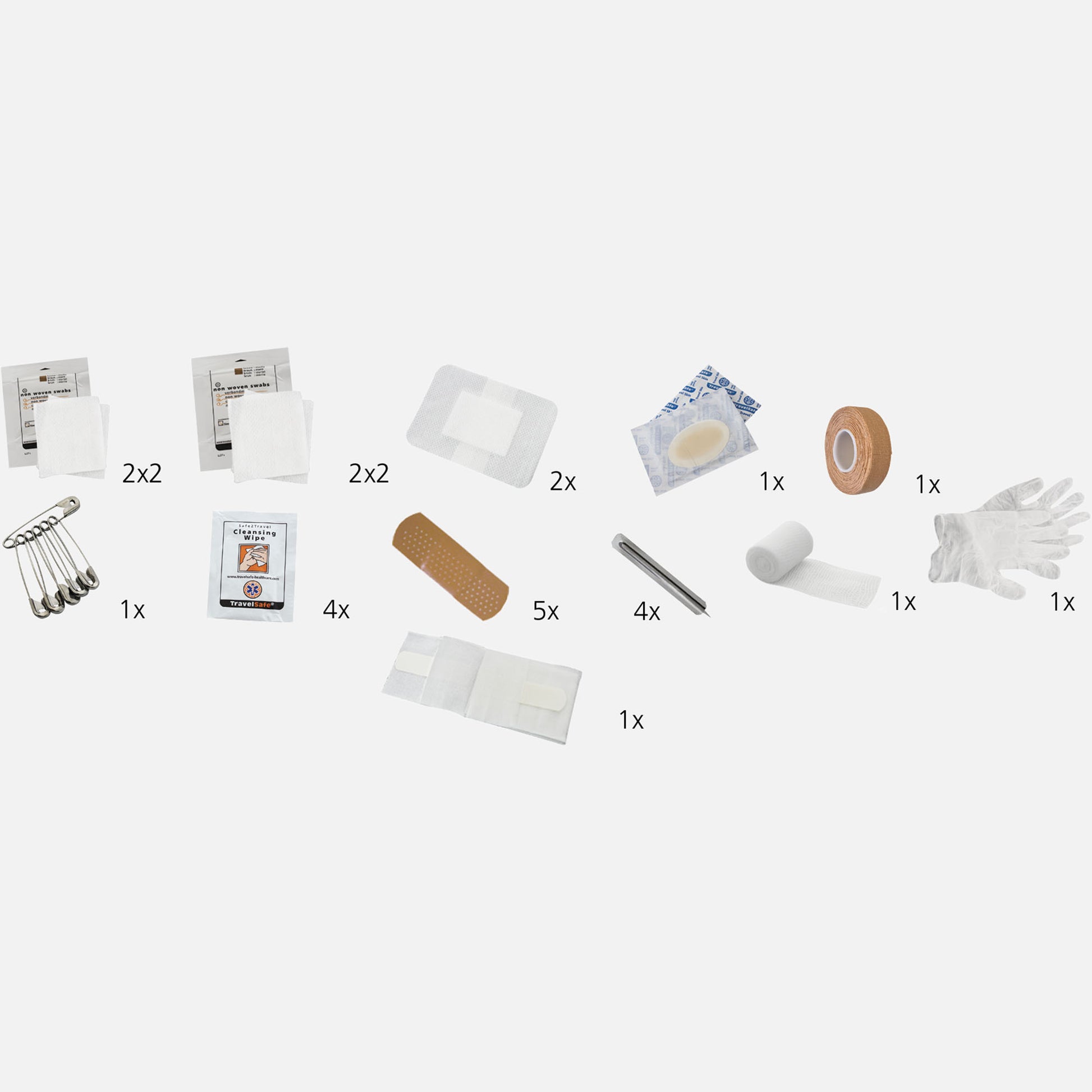 Deze set bevat alle basis EHBO-benodigdheden voor onderweg, waaronder verband, pleisters, hechtpleisters, blarenpleisters, bloedlancetten en alcoholdoekjes. Ideaal bij wondjes, blaren of letsel aan voeten en enkels tijdens lange wandelingen of hikes.